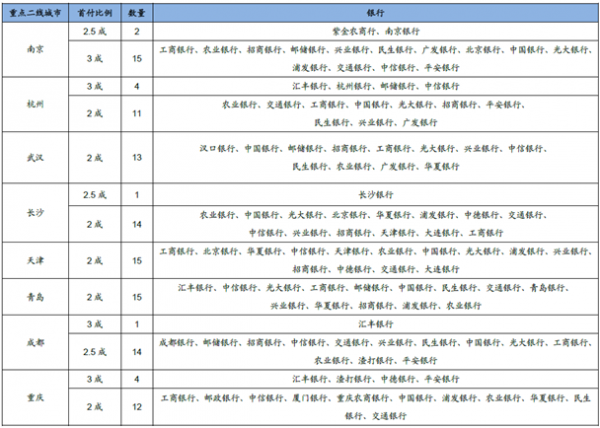 銀行均執(zhí)行2成首付;成都依舊只有匯豐銀行1家執(zhí)行3成首付,其余銀行均保持2.5成首付比例;長(zhǎng)沙則只有長(zhǎng)沙銀行1家執(zhí)行2.5成首付比例,其余銀行均執(zhí)行2成首付;南京地區(qū)銀行首付比例本月調(diào)整較大,繼7月有9家銀行的首付比例由2.5成調(diào)高3成后,8月又有4家銀行將首付比例提高至3成,僅2家銀行保持2.5成首付比例,南京信貸環(huán)境有所收緊。杭州地區(qū)首付比例也有所提高,中信銀行和中儲(chǔ)銀行將首付比例由上月2成提高至3成。