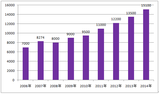 2006-2014 年全國住宅裝飾市場規模(億元)
