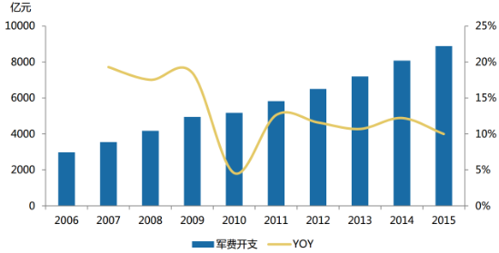 隨著我國經濟的飛速成長,國家大力發展與之配套的軍事領域,多年來我國軍費開支實現穩步上升。具體來看,2006 年我國軍費開支僅 3,000 億元,2015年預計軍費開支已接近 9,000 億元,實現了三倍的增長,且近年來軍費同比增長維持在 10%左右,呈現穩步上升趨勢。從各國的軍費開支對比來看,我國 2014年軍費開支遠遠低于美國,僅為其軍費開支的的五分之一;從各國軍費開支占GDP 的比例來看,我國軍費占比不足 2%,遠低于沙特、美國和俄羅斯,僅為沙特軍費開支占 GDP 比例的九分之一。