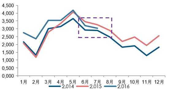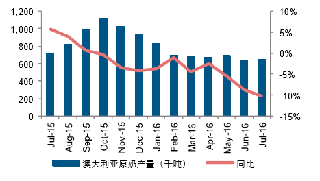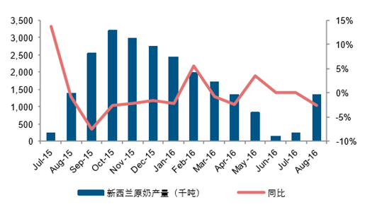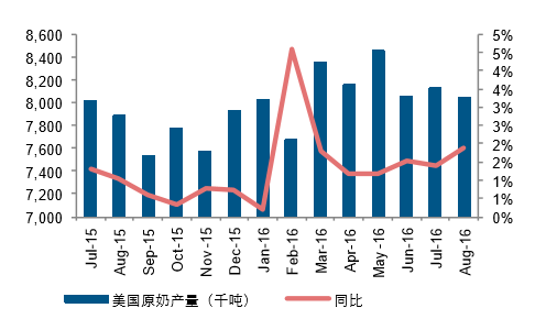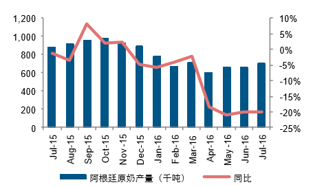 主要出口國7月份原奶產量為22834千噸,同比下滑1.15%。主要出口國原奶產量同比增速自3月份開始放 緩,連續兩個月出現下滑,3-7月同比增速分別為3.54%、0.52%、0.18%、-1.39%、-1.15%. 6、7月主要出口 國原奶產量分別下滑320、和265千噸,主要是由于歐盟產量下滑。 歐盟自6月下降,6月、7月分別下滑1.58%、1%。3-7月同比增速分別為6.01%、1.62%、0.94%、-1.58%、1%.6、7月原奶產量分別同比下滑213、129千噸。同時公開信息顯示,歐盟減產計劃順利,四季度有望減產牛 奶106萬噸,預計減少3%。新西蘭自2015年8月開始出現下滑,已經下滑11個月,6、7月份原奶產量分別為147千噸、222千噸,同比持 平,8月產奶旺季來臨,原奶產量為1342千噸,同比下滑3%,原奶產量同比減少37千噸。阿根廷已經連續8個月同比下滑, 7月原奶產量同比減少175千噸,同比下滑19.93%,達到自2010年以來同 比減少最大產量。澳大利亞已經連續10個月同比下滑,7月原奶產量同比減少74千噸,同比下滑10.31%,接近自2010年以來同 比減少最大產量。美國7月份原奶產量同比提升1.41%,增速較6月份有所放緩。1-7月原奶產量增速分別為0.19%、4.61%、 1.82%、1.19%、1.17%、1.51%、1.41%。