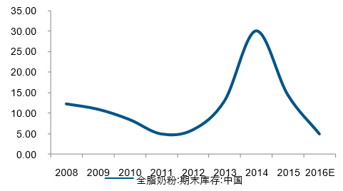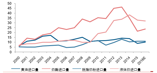 我國液體奶進口量持續增長,全脂和脫脂奶粉企穩。自2014年下半年開始我國進口大包粉數量開始負 增長,2016年1-8月我國奶粉累計進口量同比增長14%.全脂奶粉經過2015年去庫存,庫存水平逐漸降 低,根據USDA預測,2016年我國全脂奶粉的庫存水平約為5萬噸。2015年俄羅斯由于政治原因大量減少牛奶進口后對需求端造成沖擊,奶酪進口量大幅下滑39%,目前 歐盟奶酪的出口亦重回增長通道。