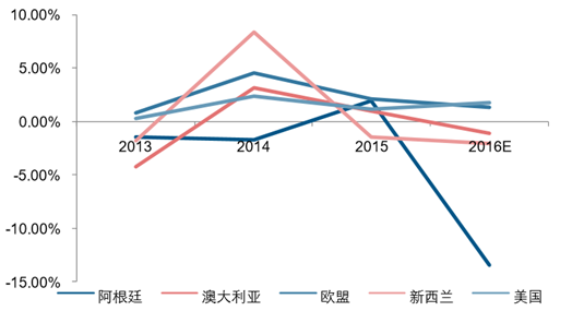 核心提示:全球主要乳制品出口國2016年原奶產量增速預計放緩。根據USDA最新預測,歐盟、美國、新西蘭、澳大利 亞、阿根廷2016年原奶產量分別同比變動1.34%、1.83%、-2%、-1.02%、-13.43%。但實際情況除了美國增 長以外,1-7全球主要乳制品出口國2016年原奶產量增速預計放緩。根據USDA最新預測,歐盟、美國、新西蘭、澳大利 亞、阿根廷2016年原奶產量分別同比變動1.34%、1.83%、-2%、-1.02%、-13.43%。但實際情況除了美國增 長以外,1-7月份其他的原奶主產國產量均在下降。