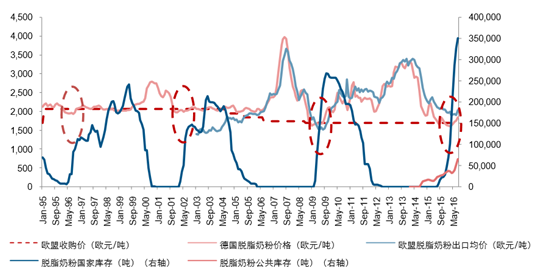 歐盟脫脂奶粉庫存情況和價格關系(歐元/噸)