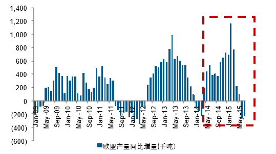歐盟作為自2015年4月開始對全球乳制品貿易增量影響最大的國家,7月份原奶產量同比下滑1%,是繼6 月同比下滑1.58%之后再次出現下滑。