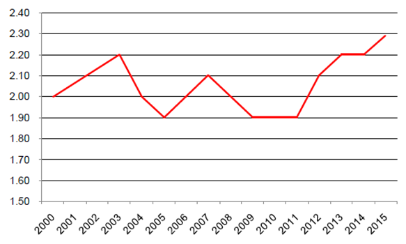 2015年,日本奶酪人均消費量達到2.29公斤,雖然與西方國家差距仍然較大,但是這已是亞洲國家中領先的消費水平,僅次于韓國(2015年人均年消費量2.61kg)。從近十幾年日本干酪消費數據來看,穩定在年人均消費干酪2kg左右。