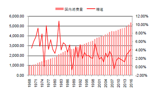 1968-2016年美國奶酪消費(fèi)總量及增速單位:千噸