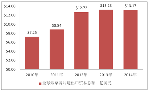 2010年全球煙草薄片進出口貿易總額為7.25億美元,2014年增長至13.23億美元,2014年下降至13.17億美元。