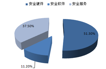 2015年在產品結構中,安全硬件以51.3%的比例仍占據市場主流,安全軟件和安全服務分別占據37.5%和11.2%的份額。