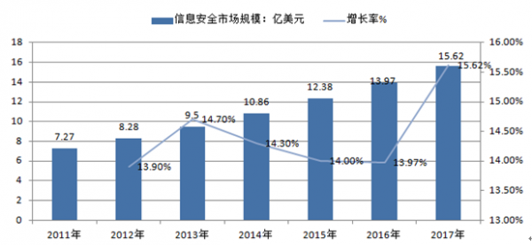 2011-2017年中國信息安全硬件市場規模及其增長率