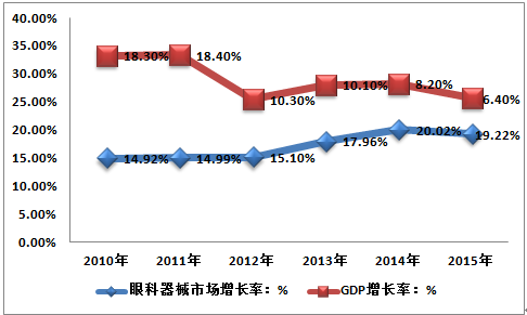 2010-2015年中國GDP增長速度及眼科器械行業(yè)增長率