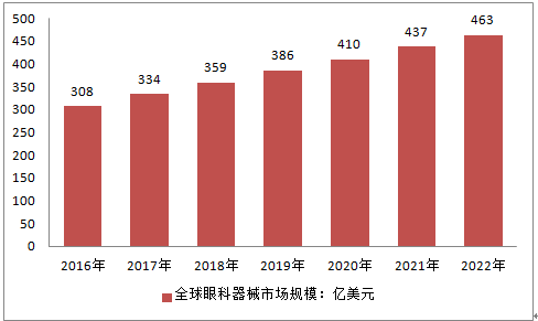 在全球人口老齡化的大背景下,未來幾年全球眼科器械行業市場將保持穩定增長,預計到2022年全球眼科器械市場規模將達到463億美元。