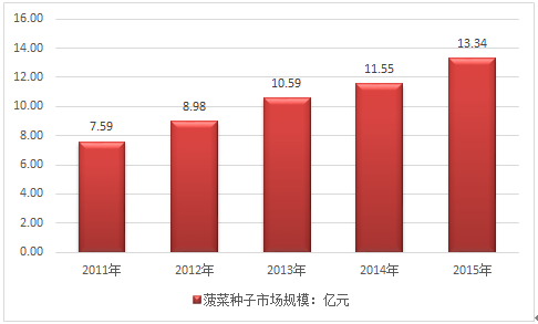 中經(jīng)先略數(shù)據(jù)中心發(fā)布的《2016-2022年中國(guó)蔬菜種子行業(yè)全景調(diào)研與發(fā)展戰(zhàn)略研究咨詢報(bào)告》顯示,2014年我國(guó)菠菜種子市場(chǎng)規(guī)模為11.55億元,2015年產(chǎn)品規(guī)模增長(zhǎng)至13.34億元,較上年同期增長(zhǎng)11.3%。