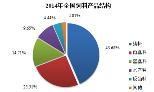 從飼養對象分類而言,我國飼料市場逐步形成以禽料、豬料為主,水產、反芻、特種動物等飼料共同發展的多樣化產品結構。我國飼料工業初建時期,禽飼料、豬飼料幾乎壟斷了整個飼料市場;1990年,禽飼料、豬飼料產量占飼料總產量的比重分別為48%、44%,其他飼料產量比重為8%;2014年,禽飼料、豬飼料產量占飼料總產量的比重分別降至40.22%、43.68%,其他飼料的比重升至15.24%。