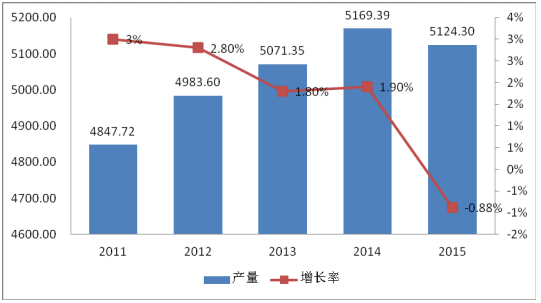 2011-2015年中國卷煙產量及增長情況(萬箱)