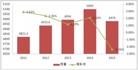 2011-2015年中國卷煙銷量及增長率走勢(萬箱)