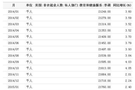 2014年1月至2015年1月美國教育和健康服務(wù)私人部門人數(shù)統(tǒng)計表: