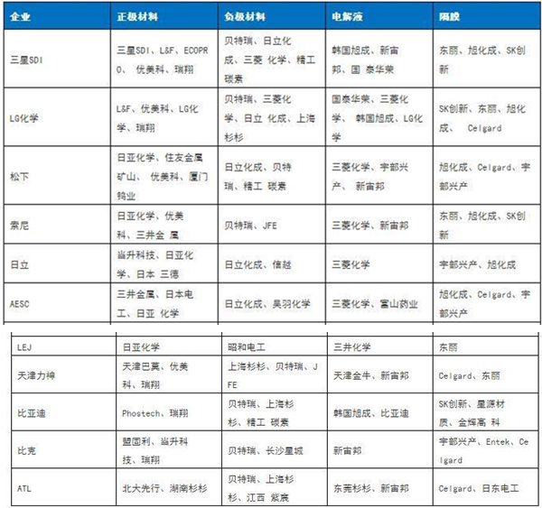 主要電池企業關鍵材料供應商情況