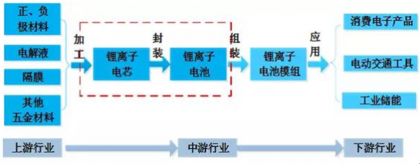 電芯廠商使用上游電芯材料廠商提供的正負極材料、電解液和隔膜生產出不同規格、不同容量的鋰離子電芯產品;模組廠商根據下游客戶產品的不同性能、使用要求選擇不同的鋰離子電芯、不同的電源管理系統方案、不同的精密結構件、不同的制造工藝等進行鋰離子電池模組的設計與生產。