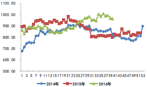 商品代雞苗價格在今年開春后一路上漲,3 月份上漲至5.27 元/羽高點,隨后的幾個月里,僅在6-7 月因飼料價格上漲,影響養殖戶盈利預期,造成短暫下跌,基本處于3-3.6 元/羽的區間,屬于高景氣價位。銷量上,2016 年商品代雞苗的銷量相比14、15 年有所上升,反映該品種的下游需求較好,往年如果養殖戶沒有利潤的話,雞苗價格會下跌至1 元/羽以內,說明養殖戶對后市情緒也較為樂觀。