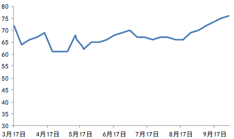 再探討下近期毛雞為什么持續走低。節前備貨結束后,下游的肉雞分割品經銷商清理庫存,導致屠宰企業的產品庫存上升,截止10 月14 日全國肉雞屠宰企業的開工率74.67%,保持平穩,庫容率81%,處于高位,如山東企業庫容率已經高達85%,一天不走貨就將滿庫。銷售壓力倒逼屠宰企業開始壓價,調低其對養殖戶的收雞保底價格,從9 月初起毛雞跌破4 元/斤,10 月14 日周五跌至3.50 元/斤,我們預計短期內分割品經銷商若沒有補貨跡象,毛雞價格可能繼續走低。