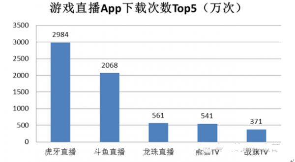游戲直播應用Android用戶下載量Top5 分別是虎牙、斗魚、龍珠、熊貓、戰旗,下載次數在千萬及百萬級別。此外,除觸手TV應用下載量也在百萬級別外,其他平臺均未過百萬,表明游戲直播五強和大部分同類APP已拉開一定差距。