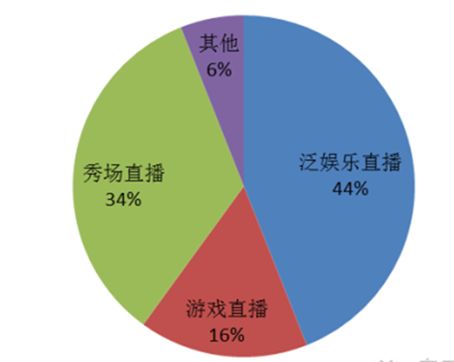 直播行業現存平臺中,44%為泛娛樂直播平臺,34%為秀場直播平臺,16%為游戲直播平臺。