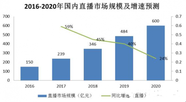 核心提示:據預測,直播市場規模(PC+移動)將從2016 年的150 億元增至 2020年的 600 億元,年復合增長率為41%。得益于移動終端全面普及、網絡環境持續優化、年輕人娛樂消費升級,移動直播重新定義了全場景、年輕化的泛娛樂方式,未來將有越來據預測,直播市場規模(PC+移動)將從2016 年的150 億元增至 2020年的 600 億元,年復合增長率為41%。得益于移動終端全面普及、網絡環境持續優化、年輕人娛樂消費升級,移動直播重新定義了全場景、年輕化的泛娛樂方式,未來將有越來越多適合移動直播的內容出現。