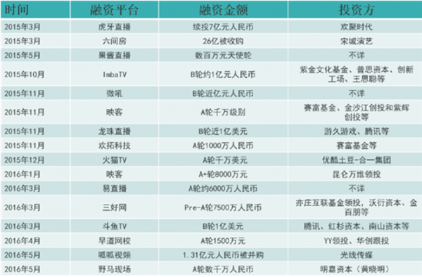 正因為市場前景廣闊,才有源源不斷的資本砸向直播應用。騰訊投資斗魚直播并迅速開通了騰訊直播,360的周鴻祎收購了花椒直播,小米CEO雷軍也上線了移動直播的產品及相關的硬件,除此之外,還有許多直播應用獲得高額投資。據不完全統計,2015年以來,已有16家直播平臺獲得從數千萬到數億不等的投資: