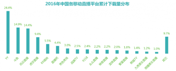 據iiMedia Research數據顯示,2016年中國移動直播平臺累計下載量,仍以傳統的游戲、秀場類直播下載量占比較高,YY憑借多年的流量積累以24.4%比例穩居第一,而KK唱響、映客、繁星直播等泛娛樂類直播平臺的使用人群也占據一定比例。隨著全民直播的興起,直播現場從固定場景向任意場景延伸,泛娛樂類及生活化直播平臺將成為移動直播新趨勢。