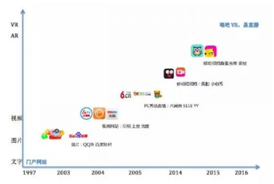 從電視直播到互聯網直播,中間走過了近20年。互聯網直播表現形式豐富,互動性、實時性強,相比傳統電視直播更具有人際傳播和大眾傳播的特點。YY、9158等公司直播互動模式的興起,標志著互聯網直播正式進入直播1.0時代。隨著技術的逐漸發展進步,過去的十年間互聯網直播經歷了三次迭代,并即將邁入VR直播的4.0時代。