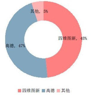 中國具有甲級測繪資質的電子地圖廠商共11家,但當前無論在車載導航還是在移動互聯網領域,都呈現出四維圖新和高德兩家壟斷競爭的趨勢。數據顯示:高德軟件和四維圖新分別以47%和48%占據中國前裝車載導航營收市場份額前兩位。四維圖新、高德軟件和凱立德以52.2%、34.1%及4.8%的比例,位居中國移動互聯網圖資市場份額三甲陣營。在移動互聯網圖資市場,電子地圖廠商市場份額的變動同與之合作的互聯網地圖服務商的市場波動情況有關。