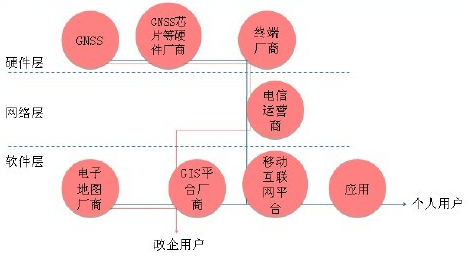 LBS業務由定位和服務兩部分組成:定位通過GNSS(全球導航衛星系統),主要通過在終端中添加GNSS芯片來實現,定位是LBS硬件層的主要功能。服務則主要通過軟件層來實現,電子地圖廠商供應地圖數據,GIS平臺廠商對數據進行運算、分析以達到特定的服務目的,GIS廠商具有一定的整合能力,可為政企客戶提供LBS解決方案;而針對個人用戶的服務則更為復雜,通常是移動互聯網平臺從電子地圖廠商和GIS平臺廠商處購買產品,整合到自己的平臺上,再通過開放API提供給應用開發者,個人用戶最終通過應用使用LBS產品。網絡層既承載一部分定位功能,也承載一部分服務功能:通過運營商基站可實現粗略定位,運營商的數據通信網絡是軟件載入的前提。