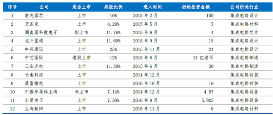 正是居于這樣的高依存度,關系到國家安全的角度,國家隊選擇果斷出手,在2014年開始選擇以資本方式介入到全球產業鏈。一方面大力扶持本土企業,對細分領域的龍頭企業直接在通過定增或二級市場方式買入股權,另一方面與細分龍頭公司組成聯合體去海外收購資產,比如紫光國芯、長電科技和通富微電就是很好的例子。目前國家資本已介入到12家上市或擬上市公司中,合計投入資本超過250億,如果再加上各省市發起設立的專項基金,規模會更大,可以看出國家隊的決心。