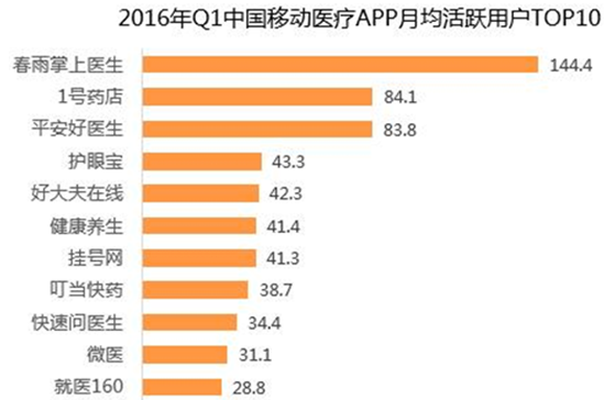 核心提示:調查顯示,2016年第一季度主要移動醫療APP月均活躍用戶方面,春雨掌上醫生以144.4萬人的月活躍用戶數穩居首位,1號藥店和平安好醫生分別以84.1萬人和83.8萬人排名二、三位。2011年11月春雨掌上醫生進行A輪融資,藍馳創投投資調查顯示,2016年第一季度主要移動醫療APP月均活躍用戶方面,春雨掌上醫生以144.4萬人的月活躍用戶數穩居首位,1號藥店和平安好醫生分別以84.1萬人和83.8萬人排名二、三位。