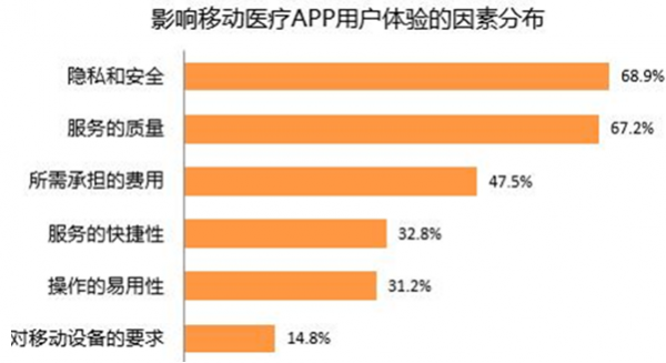 報告數據還顯示,影響移動移動醫療APP用戶體驗的因素中,隱私和安全占比最高,達68.9%,其次為服務的質量,占比67.2%,而所需承擔的費用占比47.5%,位列第三位。