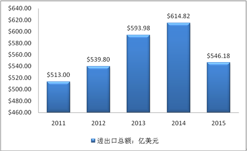 年份進口額:美元出口額:美元2015$26,636,333,998$27,981,994,3662014$30,151,147,276$31,330,779,4742013$29,159,126,476$30,239,223,1852012$26,555,698,573$27,424,745,4282011$25,029,464,560$26,270,293,198資料來源:公開資料整理