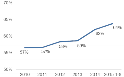 2010-2015年中國原油進口量情況
