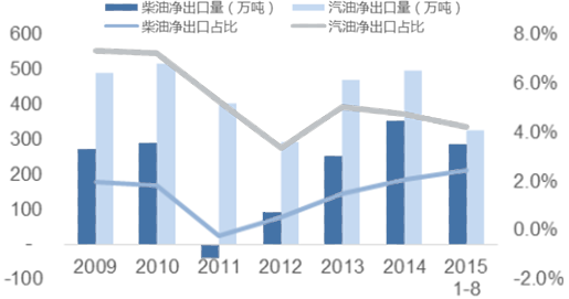 2009-2015年中國柴油、汽油凈出口量及出口占比情況