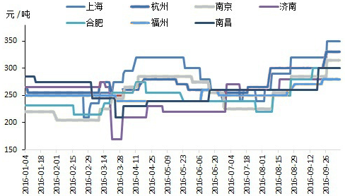 華東地區上半年對水泥熟料價格進行了四輪上調,隨后價格逐漸趨穩。進入梅雨季節后,市場需求萎縮,價格持續下行,尤其是長三角地區,導致前期的上漲基本回吐。8月開始受G20影響大面積停工出現,市場供應下滑明顯,水泥價格實現整體大幅反彈。9月G20停窯限產影響逐漸消退,但除了山東市場因錯峰停窯價格暫穩外,其他市場水泥價格整體繼續強勢上漲,預計此輪上漲期將持續至10月上旬。