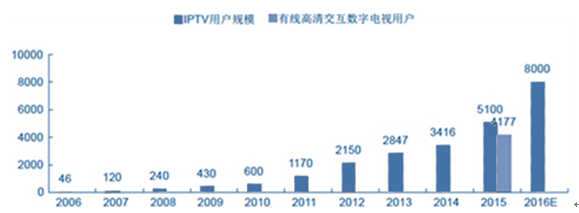 多重利好之下,IPTV用戶量在近半年高速發展至5000萬戶,已超過有線雙向交互的數字電視用戶(4000萬),且2016年有可能發展至8000萬以上量級。2015年,中國電信IPTV用戶量增長900萬,達到4000萬左右,聯通IPTV用戶達到1124萬,兩者相加超過5000萬,已經超過有線體系中可雙向交互的數字電視用戶。中國移動雖然目前沒有IPTV傳輸牌照,但獲得資質預計也只是時間問題,并且中國移動本身擁有規模龐大的用戶群體,也有利于未來IPTV業務的捆綁推廣。隨著三大運營商齊齊發力,2016年IPTV用戶預計將得到爆發增長,用戶規模接近億級。