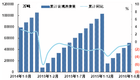 核心提示:鋼材表觀消費量同比降幅逐步趨窄。國家統計局數據顯示,2016年1-6月,鋼材表觀消費量為50,926.1萬噸,同比降低0.7%,降幅較2016年1-5月和去年同期均收窄0.3個百分點。需要說明的是,盡管從表觀消費量上來看鋼材需求逐步回升,但鋼材表觀消費量同比降幅逐步趨窄。國家統計局數據顯示,2016年1-6月,鋼材表觀消費量為50,926.1萬噸,同比降低0.7%,降幅較2016年1-5月和去年同期均收窄0.3個百分點。需要說明的是,盡管從表觀消費量上來看鋼材需求逐步回升,但是行業供給過剩的現狀并未改變,后期去庫存和去產能的壓力依然較大。