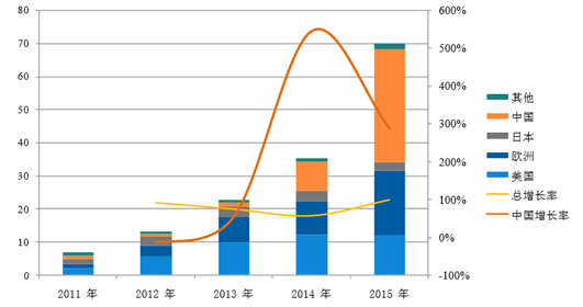 2011年~2015年電動汽車市場銷量急劇上升,中國市場表現耀眼(萬輛)