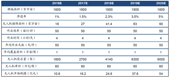 相比于傳統(tǒng)人工的農(nóng)藥噴灑和病蟲害防治,航空植保有高效、安全等優(yōu)勢(shì)。無(wú)人直升機(jī)在植保過(guò)程中除了兼具航空作業(yè)的普遍優(yōu)勢(shì)外,還可以進(jìn)一步降低人力成本。全國(guó)耕地面積為18億畝,2015年農(nóng)業(yè)植保滲透率不到1%。我們預(yù)計(jì)到2020年農(nóng)業(yè)植保滲透率可達(dá)5%,對(duì)應(yīng)植保面積為1.8億畝。植保型無(wú)人直升機(jī)工作效率按50畝/小時(shí),年均工作200小時(shí),則單架無(wú)人機(jī)年覆蓋耕地面積為1萬(wàn)畝,2020年我國(guó)植保型無(wú)人直升機(jī)需求總量約為9000架,平均單價(jià)按60萬(wàn)元計(jì)算,植保無(wú)人機(jī)市場(chǎng)規(guī)模約為54億元,預(yù)計(jì)占民用無(wú)人機(jī)市場(chǎng)超過(guò)25%。未來(lái)隨著無(wú)人機(jī)農(nóng)業(yè)植保的滲透率進(jìn)一步增加,植保無(wú)人機(jī)的需求將進(jìn)一步擴(kuò)大。