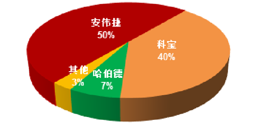全球有三大白羽曾祖代種雞繁育企業,美國安偉捷公司(母公司為德國 EW 集團)、美 國科寶育種公司(母公司為泰森食品 TSN.N)和法國哈伯德伊莎公司,其產能分別達 350 萬套、280 萬套和 50 萬套,三者合計占全球市場份額高達 97%。其主要品種包括 羅斯、愛拔益加、科寶和哈伯德,四者合計占全部白羽肉種雞市場份額高達 92%。
