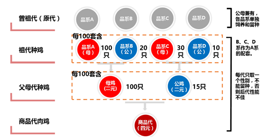 白羽肉雞從原種雞開始的一系列雜交過程,其目的是通過雜交獲得 各品系差異化遺傳特征中最有利于肉雞生產效益的生物特性。種雞代次越高,其通過雜 交體現遺傳性能的作用越重要,種雞細微的差異對后代生產性能的影響越明顯,因而其 飼養和生產技術要求越高。種雞的引種、飼養、繁育過程復雜且無法間斷,,生物體在 生命發展的各個階段體現出不同的生理特征,需要在飼養環境、飼養手防治等方面適應 生物生長規律。不同祖代雞品種性狀不同,科寶的產蛋低,翅膀小,胸肉大,適合美國國情;羅斯 308 產蛋多、胸肉小、翅膀大、生長快、飼料報酬高、產肉量高充分滿足了生產多用途肉雞 系列產品的生產者(全雞、分割肉和深加工)之需,適合中國國情,近年也取得了較大 的成功。