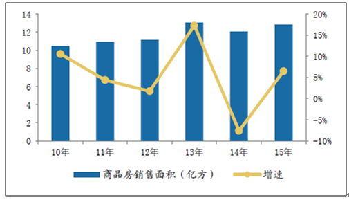 2010-2015年全國商品房年度銷售面積(億平米)及增速