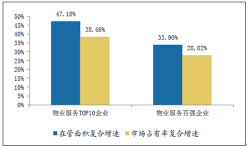 主流物業管理公司在行業發展的大趨勢下更具優勢,12年至15年百強企業管理面積年均復合增長率達到33.9%。隨著互聯網、移動互聯網、大數據等高新技術與行業的深度融合,物業服務企業逐步打破地域界限走向全國化,部分具備相當規模和品牌影響力、有較強資源整合能力且在移動互聯網應用方面較為成熟的優秀物業服務企業,受到資本市場的密切關注。通過兼并收購不斷擴大市場份額,促進行業集中度迅速提升,淘汰落后企業,實現了行業跨越式發展。