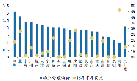 從城市的情況來看,16年上半年全國二十大城市物業服務價格指數同比上漲0.87%,環比上漲0.52%,平均物業服務費為2.08元/平米/月。由此可見百強企業平均服務價格高于重點城市平均水平。城市間的變化情況來看,16年上半年重點城市同比及環比物業服務價格均出現了不同程度的上漲,其中常州市漲幅最高,同比上漲4.13%,而單城市平均物業管理費用最高的城市為深圳,為3.1元/平米。