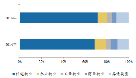 物業類型分類方面,15年百強企業住宅物業管理收入506.5億元,占物業服務費總收入的53.6%,與14年同期相比增長68.1%,是物業企業收入的基礎。辦公、商業、工業園區管理收入占比分別為22.34%、6.80%和4.75%,其中工業園區管理收入增長顯著,而辦公和商業物業收入增速都要低于住宅增長水平。
