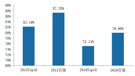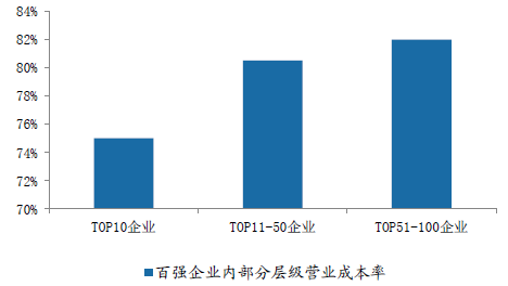 百強企業2015年經營成本總值為人民幣908.04億元,均值43239.94萬元,同比2014年增長16.56%。2015年百強企業營業成本率均值為79.96%,同比2014年降低了7.32個百分點。營業成本率的下降得益于更為快速的營業收入的增長。